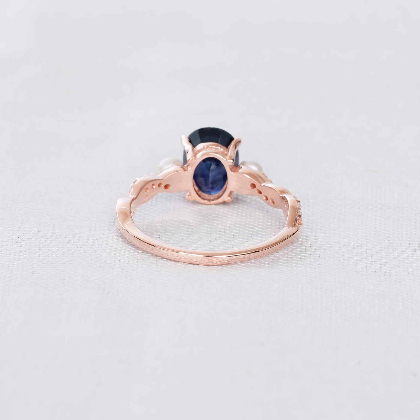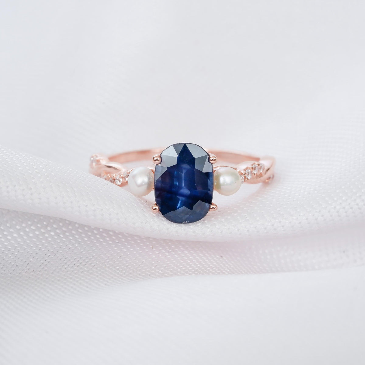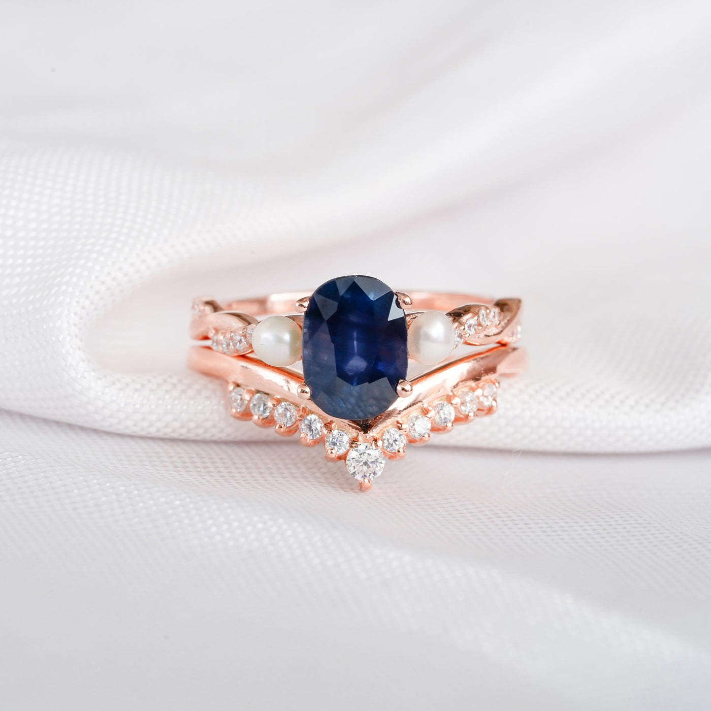 Blue Sapphire Engagement Ring Set Matching Moissanite Chevron Wedding Band For Women ArtDeco Pearl Accent Infinity Halo Bridal Proposal Ring