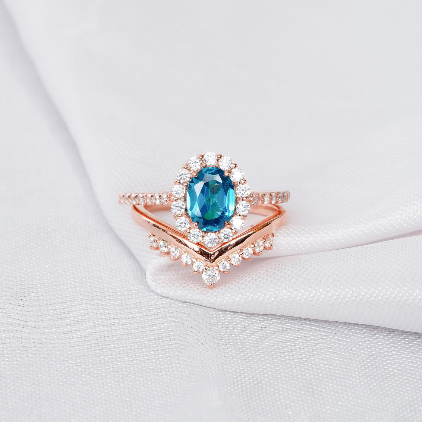 Blue Topaz Ring Set For Women Matching Moissanite Chevron Wedding Band 925 Sterling Silver Halo London Blue Topaz Engagement Bridal Ring