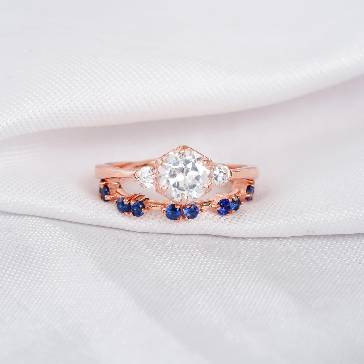 Moissanite Engagement Ring Set For Women 925 Sterling Silver Three Stone Bridal ArtDeco 1.5c Ring Matching Blue Sapphire Dainty Wedding Band