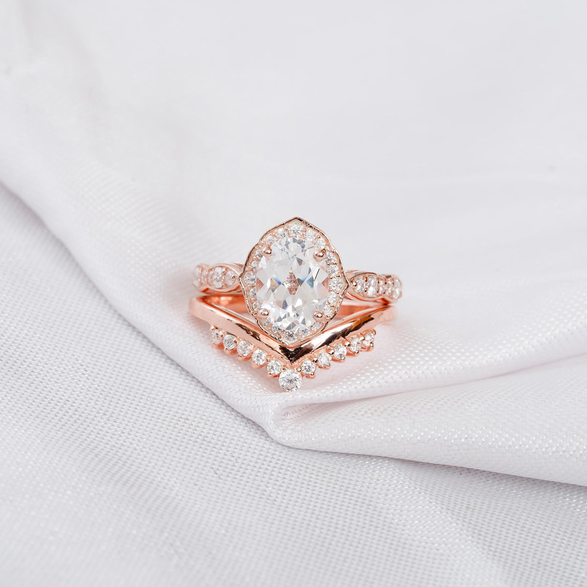 Moissanite Ring Set For Women 925 Sterling Silver Milgrain Bridal Oval 2ct Art Deco Engagement Ring Matching Moissanite Chevron Wedding Band - 925 Sterling Silver / 3