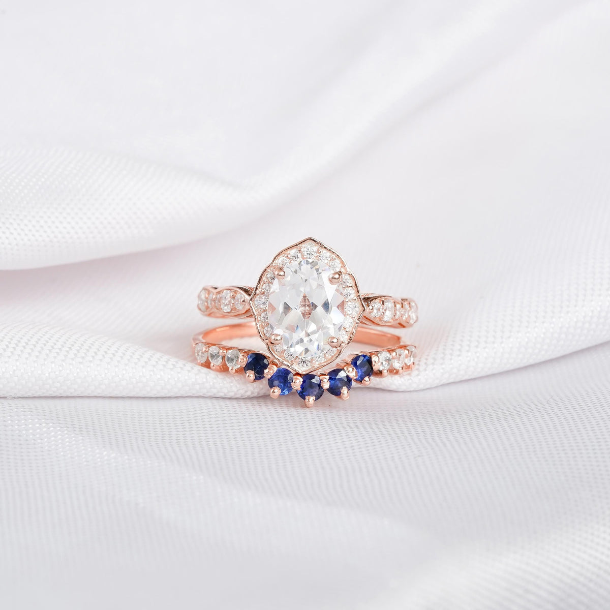 Art Deco Moissanite Engagement Ring Set For Women 925 Sterling Silver Milgrain Bridal Oval 2ct Ring Matching Blue Sapphire Wedding Band - 925 Sterling Silver / 3
